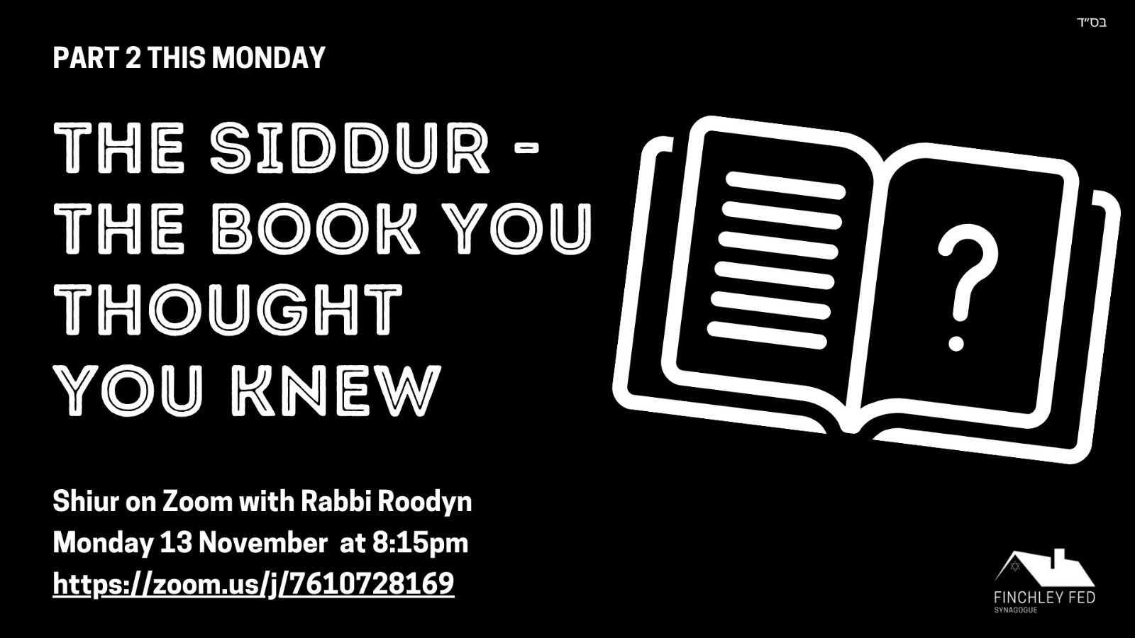 Second Part of The Siddur – The Book You Thought You Knew this Monday 13 November at 20:15pm live on zoom. You can listen to the shiur live on Monday evening by clicking here zoom.us/j/7610728169.